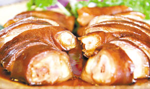 這道菜顏色誘人,做法也不會特別復(fù)雜。只要以豬手為原料,在傳統(tǒng)的鹵水上加入普洱茶葉,浸鹵2個(gè)小時(shí)而成。據(jù)何劍峰說,茶葉含有茶堿,茶堿能去肥膩,也增加了肉質(zhì)的爽滑度。