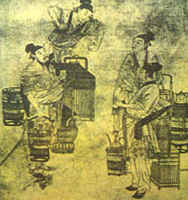 元代書畫家趙孟俯的《斗茶圖》,是一幅充滿生活氣息的風俗畫。畫面有四個人物,身邊放著幾副盛有茶具的茶擔。左前一人,足穿草鞋,一手持茶杯,一手提茶桶,坦胸露臂,似在夸耀自己的茶質香美。身后一人雙袖卷起,一手持杯,一手提壺,正將茶水注入杯中。右旁站立兩人,雙目凝視,似在傾聽對方介紹茶的特色,準備回擊。圖中,人物生動,布局嚴謹。人物模樣,不似文人墨客,而像走街串巷的貨郎,這說明當時斗茶已深人民間。