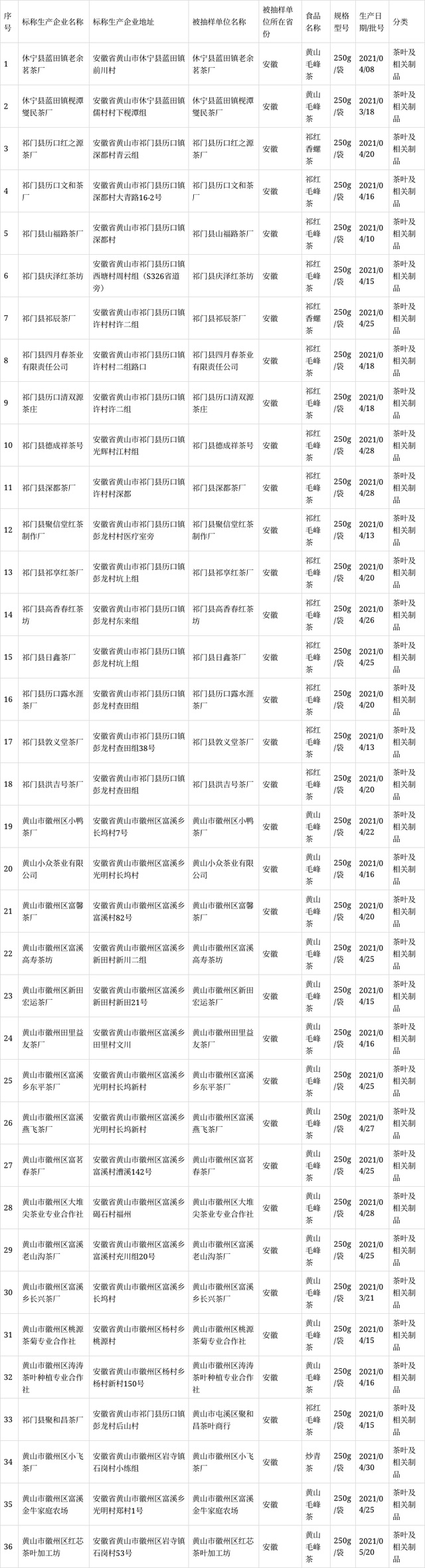 安徽省黃山市市場監(jiān)管局公布36批次茶葉及相關(guān)制品抽檢結(jié)果