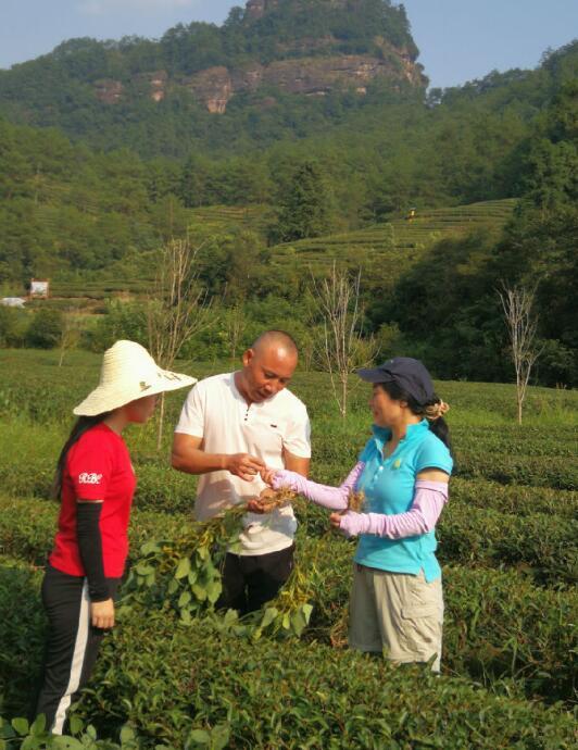 為探索茶園高效、生態(tài)、環(huán)保建設(shè)模式,福建農(nóng)林大學根系生物學研究中心主任廖紅與團隊走進星村鎮(zhèn),把高效豆科作物提高茶樹的養(yǎng)分利用效率,并達到減肥增效等科研成果,運用到茶葉基地建設(shè),以提高茶葉的產(chǎn)量及質(zhì)量。廖紅教授認為,茶豆套種作用明顯,大豆可產(chǎn)生根瘤菌,具有固氮作用,增加土壤肥力,茶園里套種大豆可少下或不下氮肥。同時,金龜子、蚜蟲等更喜歡大豆葉子,從而減少茶樹蟲害。還能增加茶葉產(chǎn)量,實驗表明,靠近大豆的茶樹每平方米可長出190個芽梢數(shù),比沒有靠近大豆的茶樹多出一倍。