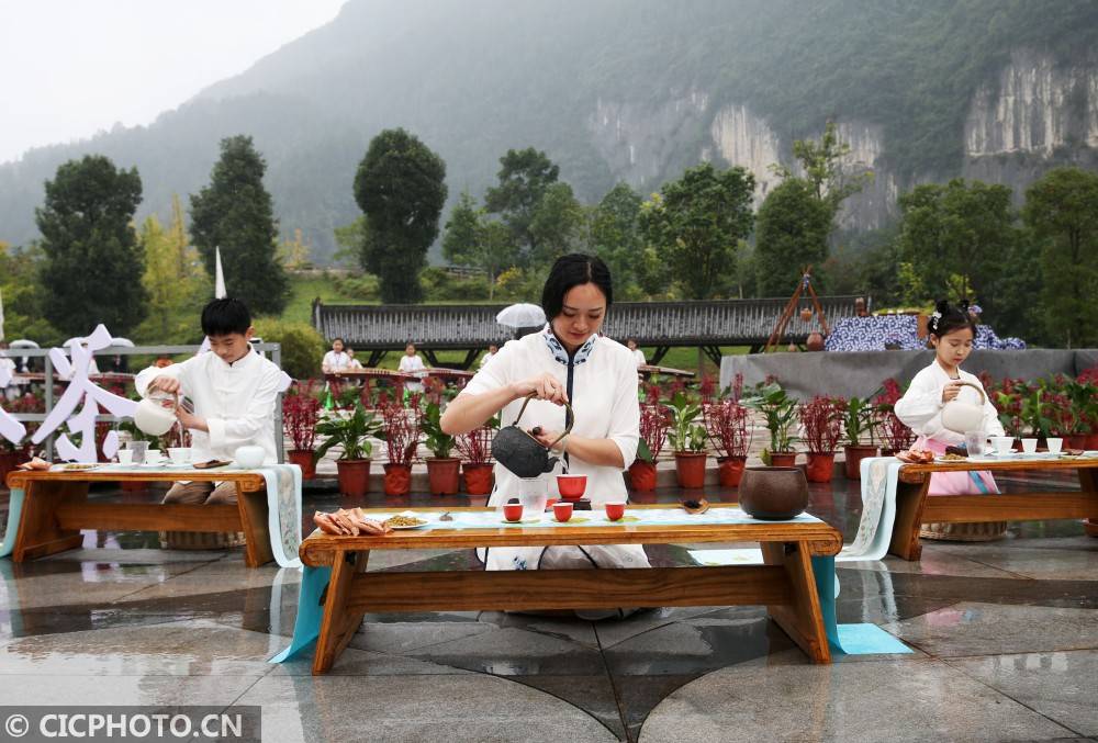 以上圖片:茶藝師在重慶市黔江區(qū)城市大峽谷景區(qū)表演茶藝。CICPHOTO/楊敏 攝