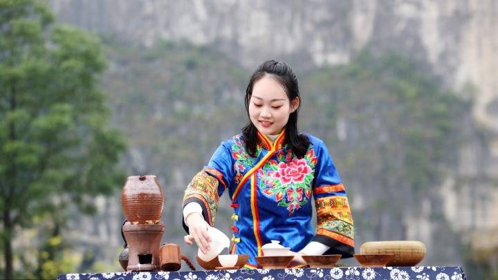 2020年10月1日,重慶市黔江區(qū)在城市大峽谷景區(qū)舉辦中秋茶會。100多名茶藝師在當(dāng)?shù)孛駱穲F(tuán)演奏的《彩云追月》《花好月圓》《高山流水》等民樂聲中,為游客表演精湛的茶藝,讓游客在品茶香、賞民樂中祝福祖國,歡度中秋。